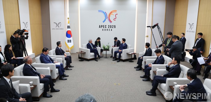 [서울=뉴스핌] 이재명 대통령이 31일 APEC 정상회의장인 경주화백컨벤션센터에서 젠슨 황 엔비디아 최고경영자를 접견하고 있다. 젠슨 황 왼쪽으로 이재용 삼성전자 회장, 최태원 SK그룹 회장, 정의선 현대차그룹 회장, 이해진 네이버 이사회 의장. [사진=APEC 2025 KOREA & 연합뉴스] 2025.10.31 photo@newspim.com