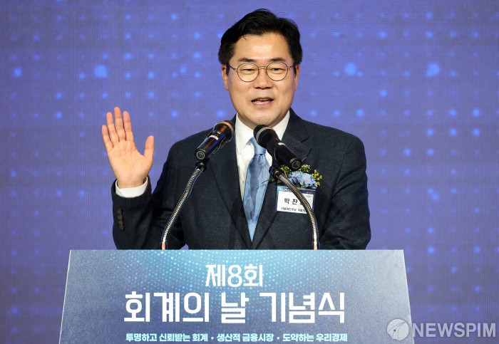 [서울=뉴스핌] 정일구 기자 = 박찬대 더불어민주당 의원이 31일 오후 서울 영등포구 FKI타워 컨퍼런스센터에서 열린 제8회 회계의 날 기념식에서 축사를 하고 있다. 2025.10.31 mironj19@newspim.com