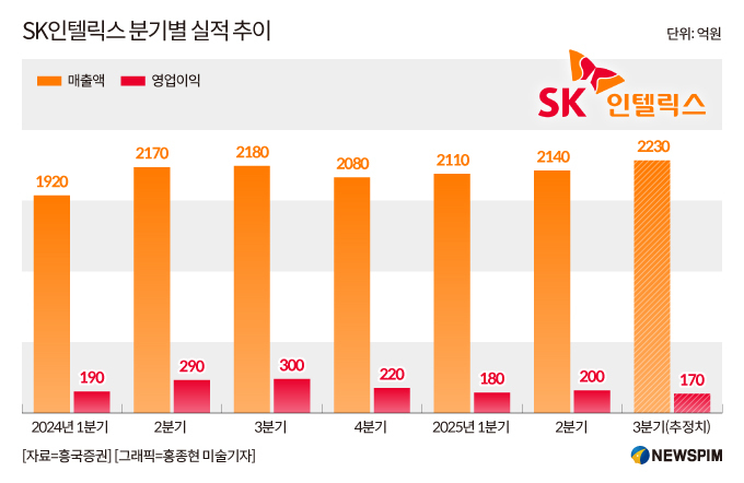 SK인텔릭스의 3분기 영업이익은 다소 주춤할 전망이다. 업계에 따르면 3분기 예상 영업이익은 약 170억원으로, 전년동기(300억원) 대비 약 43% 감소한 수준이다.