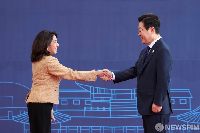 [서울=뉴스핌] 이재명 대통령이 31일 오전 경북 경주시 경주화백컨벤션센터(HICO)에서 열린 2025 아시아태평양경제협력체(APEC) 정상회의에 참석한 테레사 메라 고메스 페루 통상관광부 장관을 맞이하고 있다. [사진=APEC 2025 KOREA & 연합뉴스] 2025.10.31 photo@newspim.com
