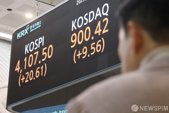[서울=뉴스핌] 이형석 기자 = 31일 오후 코스피가 전장 종가보다 20.61 포인트(0.50%) 상승하며 4107.50으로, 코스닥은 9.56 포인트(1.07%) 상승한 900.42로 장을 마감한 가운데, 서울 여의도 한국거래소 전광판에 지수가 표시되고 있다. 2025.10.31 leehs@newspim.com
