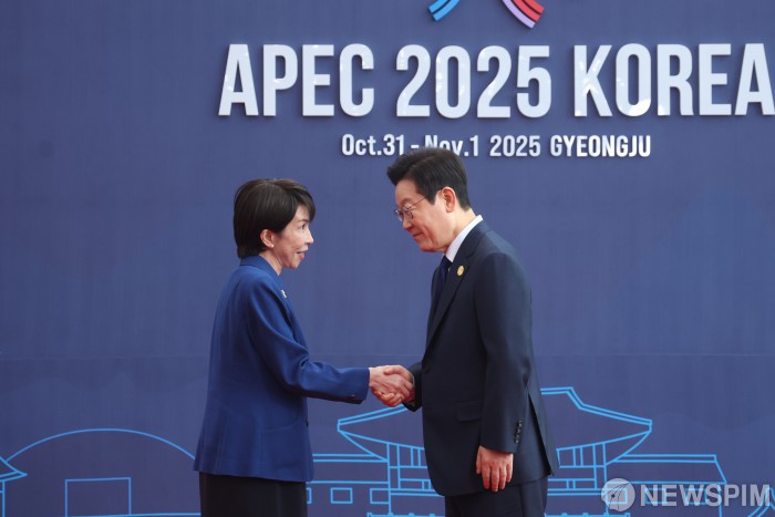 [서울=뉴스핌] 이재명 대통령이 31일 오전 경북 경주시 경주화백컨벤션센터(HICO)에서 열린 2025 아시아태평양경제협력체(APEC) 정상회의에 참석한 다카이치 사나에 일본 총리를 맞이하고 있다. [사진=APEC 2025 KOREA & 연합뉴스] 2025.10.31 photo@newspim.com
