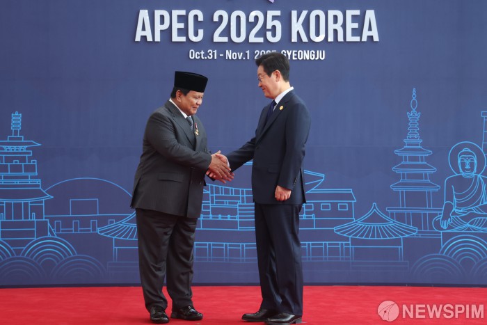 [서울=뉴스핌] 이재명 대통령이 31일 오전 경북 경주시 경주화백컨벤션센터(HICO)에서 열린 2025 아시아태평양경제협력체(APEC) 정상회의에 참석한 프라보워 수비안토 인도네시아 대통령을 맞이하고 있다. [사진=APEC 2025 KOREA & 연합뉴스] 2025.10.31 photo@newspim.com