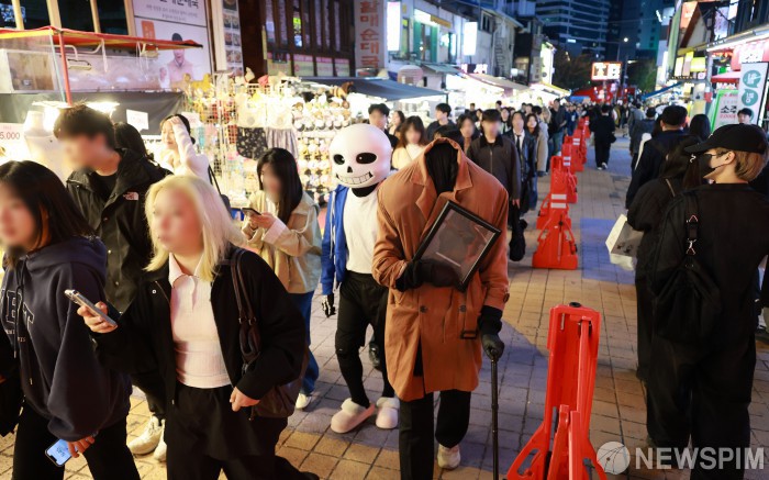 [서울=뉴스핌] 김학선 기자 = 핼러윈 데이인 31일 인파 밀집 지역인 서울 마포구 홍대 거리에 인파 사고를 대비한 안전펜스가 설치되어 있다. 2025.10.31 yooksa@newspim.com