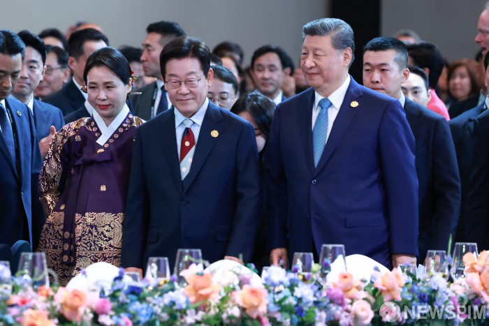 [서울=뉴스핌] 이재명 대통령과 시진핑 중국 국가주석이 31일 경북 경주의 한 호텔에서 열린 APEC 정상회의 환영 만찬에 참석하고 있다. [사진=APEC 2025 KOREA & 연합뉴스] 2025.10.31 photo@newspim.com