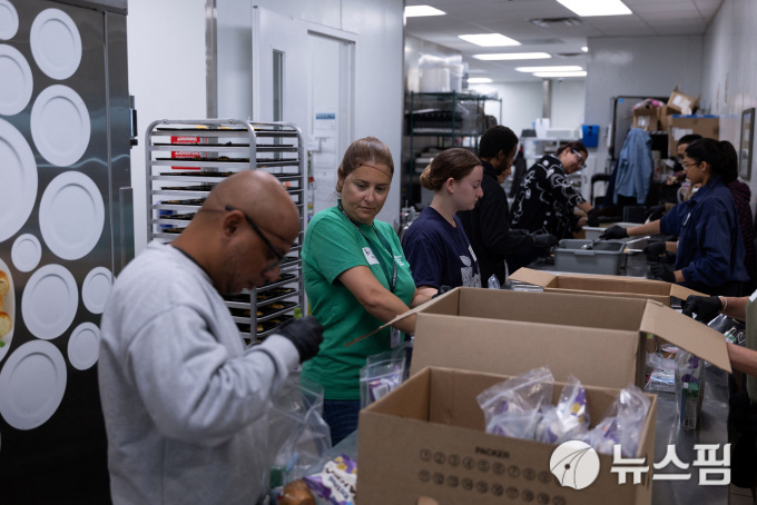 미국 텍사스주의 푸드뱅크 창고에서 자원 봉사자들이 식료품을 담고 있다. [사진=로이터 뉴스핌]