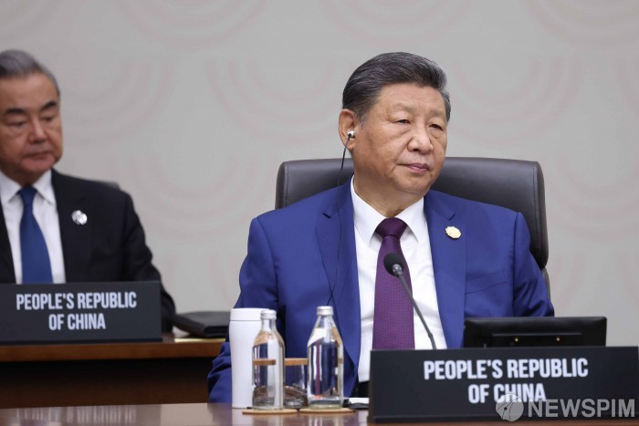 [서울=뉴스핌] 시진핑 중국 국가주석이 1일 경주화백컨벤션센터(HICO)에서 열린 2025 아시아태평양경제협력체(APEC) 정상회의 제2세션에 참석하고 있다. [사진=APEC 2025 KOREA & 연합뉴스] 2025.11.01 photo@newspim.com