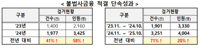 앞서 국수본은 지난해 11월부터 지난달까지 불법사금융 특별단속을 추진해 총 3251건·4004명을 검거했다. 이는 지난해 같은 기간(1901건·3330명) 대비 검거 건수는 71%, 인원은 20% 증가한 수치다.