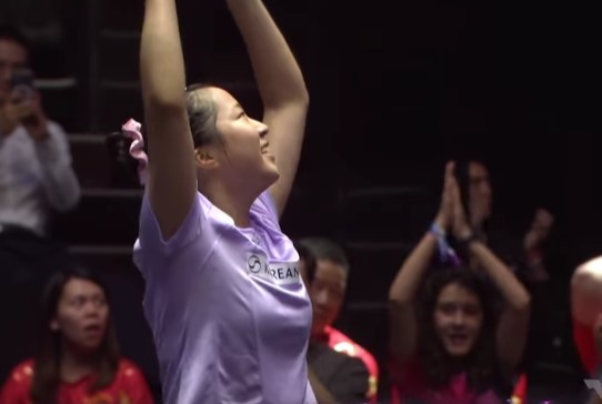 | 신유빈이 2일(한국시간) 몽펠리에에서 열린 WTT 챔피언스 여자 단식 8강에서 천이를 꺾고 기뻐하고 있다. [사진=WTT 동영상 캡처] |