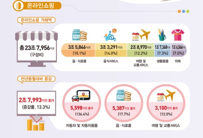 음식서비스와 여행 및 교통서비스는 각각 3조3291억원, 2조8970억원으로 음·식료품 뒤를 이어 거래액이 많았다. 1년 전과 비교하면 차례대로 1934억원(6.2%), 3100억원(12.0%) 증가했다.