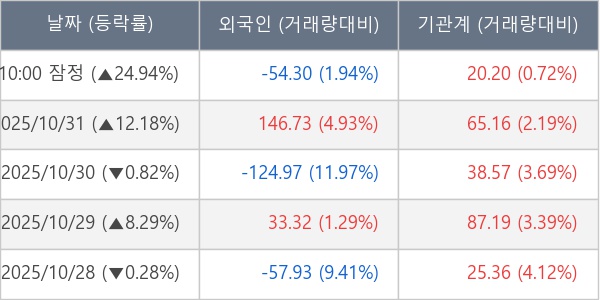 [서울=뉴스핌] 로보뉴스 = 03일 10시 15분 현재 대한광통신(010170)은 전일 대비 24.94% (현재가 2,705원) 상승했고, 기관이 최근 5일 연속 순매수(누적 236.47만 주, 잠정) 행진을 하고 있다.