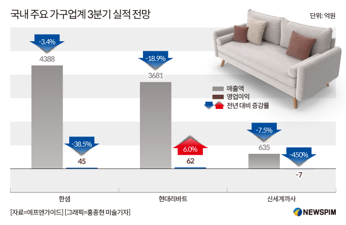 [서울=뉴스핌] 이석훈 기자 = 가구업계의 올해 3분기 실적 전망이 어둡다. 한샘과 현대리바트, 신세계까사의 매출은 각각 전년 동기 대비 3.4%, 18.9%, 7.5% 감소할 것으로 예상된다.