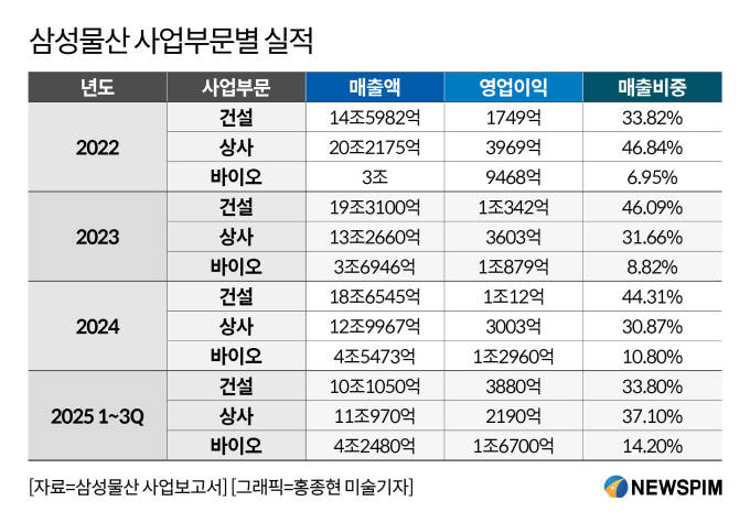 3분기 매출 비중 상사 38.3%·건설 30.4%...영업이익 72.2%가 바이오