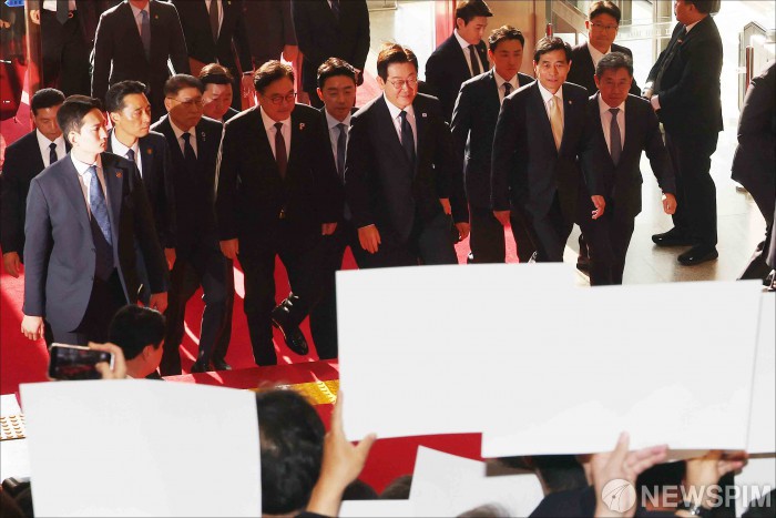 [서울=뉴스핌] 윤창빈 기자 = 이재명 대통령이 4일 오전 서울 여의도 국회 본청에서 열린 국회 본회의에서 2026년도 예산안 및 기금운용계획안 대통령 시정연설을 위해 우원식 국회의장의 영접을 받으며 국회 본청을 들어서고 있다. 2025.11.04 pangbin@newspim.com