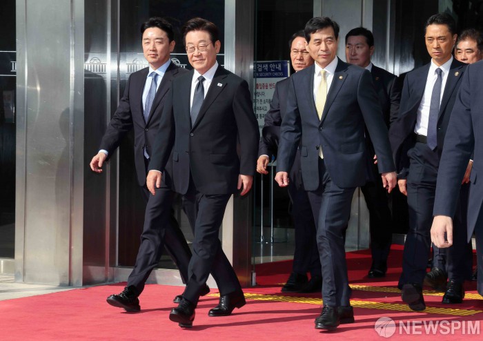 [서울=뉴스핌] 윤창빈 기자 = 이재명 대통령이 4일 서울 여의도 국회에서 내년도 정부 예산안에 대한 시정연설을 마친 뒤 나서고 있다. 2025.11.04 pangbin@newspim.com