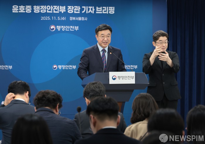 [서울=뉴스핌] 이길동 기자 = 윤호중 행정안전부 장관이 5일 서울 종로구 정부서울청사에서 기자 브리핑을 하고 있다.2025.11.05. gdlee@newspim.com