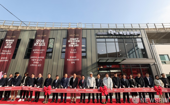 [서울=뉴스핌] 최지환 기자 = 오세훈 서울시장이 6일 오후 서울 서대문구 홍제폭포 복합문화센터 앞에서 열린 홍제폭포 복합문화센터 개관식에서 이성헌 서대문구청장을 비롯한 참석자들과 테이프커팅식을 하고 있다. 2025.11.06 choipix16@newspim.com