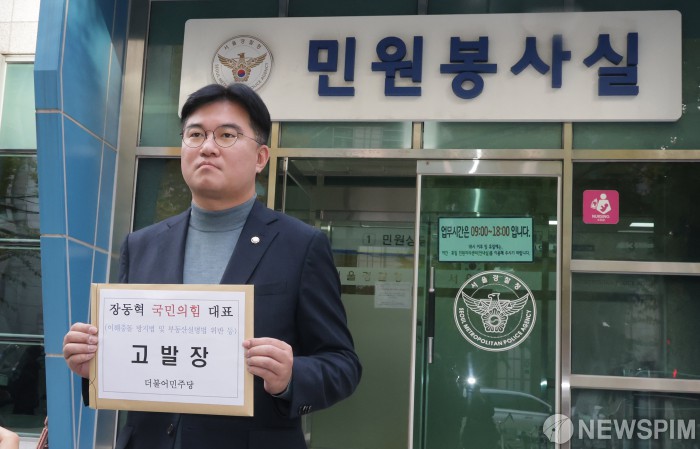 [서울=뉴스핌] 양윤모 기자 = 정준호 더불어민주당 의원이 6일 오후 서울 종로구 서울경찰청 민원실을 찾아 장동혁 국민의힘 대표의 이해충돌 방지법 및 부동산실명법 위반 등 의 고발장을 보여주고 있다. 더불어민주당은 장동혁 국민의힘 당대표(충남 보령서천·재선)의 소유 토지를 두고 윤석열 전 대통령 부인 김건희씨 일가의 양평고속도로 노선 수정안 2탄으로 빗대며 부동산 투기 의혹을 제기했다. 2025.11.06 yym58@newspim.com