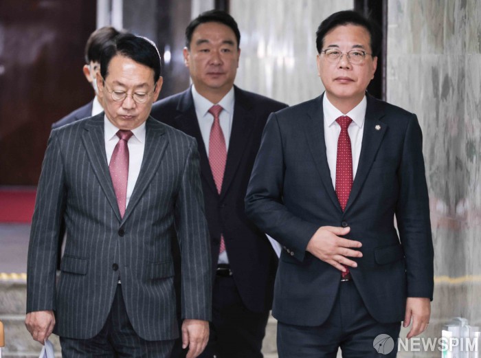 [서울=뉴스핌] 윤창빈 기자 = 송언석 국민의힘 원내대표, 김도읍 정책위의장, 정희용 사무총장이 7일 오전 서울 여의도 국회에서 열린 원내대책회의에 참석하고 있다. 2025.11.07 pangbin@newspim.com