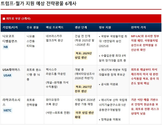 전략광물 부문이 그 시작점이다. 당장은 경쟁국에 대한 수입 의존도가 높아 생산 기반 확장이 시급하게 평가되는 분야다. 다음은 정책과 연계돼 있거나 그 가능성이 유력하게 평가되고 명확한 산업 수요처를 지녀 수익성이 기대되는 전략광물(희토류·우라늄) 회사들이다.