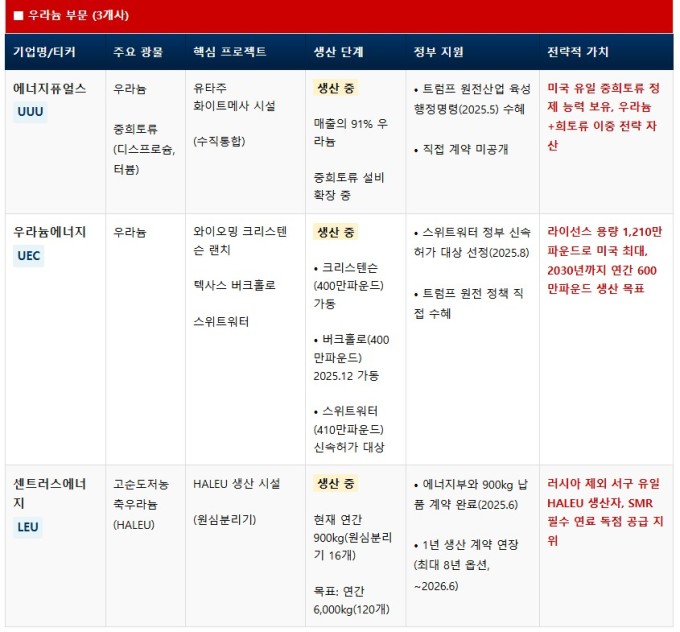 에너지퓨얼스(UUU)는 유타주 화이트메사 시설에서 우라늄을 생산한다. 우라늄 판매를 통해 매출을 올리고 있는 회사로 제련소까지 보유한 우라늄 수직통합 기업이다. 올해 5월 트럼프 대통령의 원전산업 육성 행정명령으로 장기 성장 기반도 마련됐다.