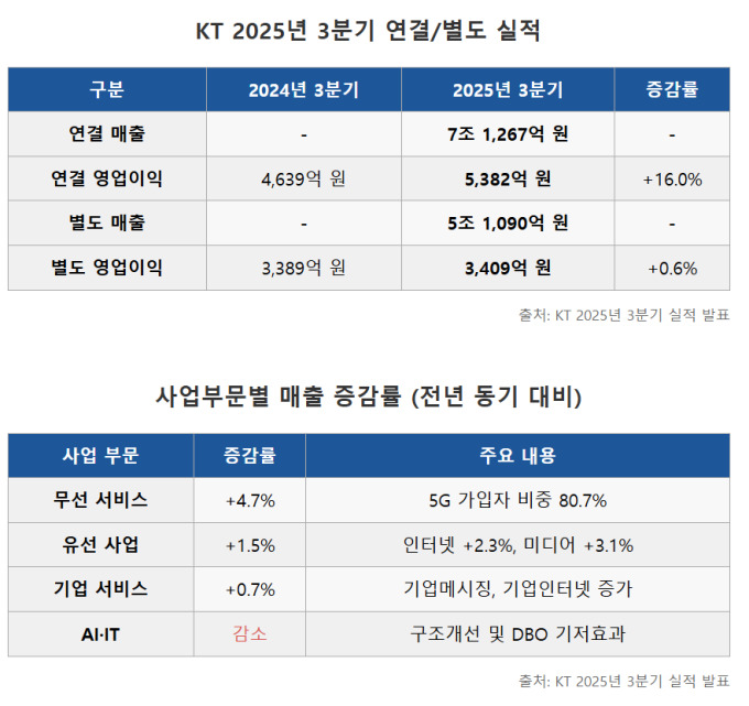7일 KT는 연결 기준 매출 7조 1267억 원, 별도 기준 매출 5조 1090억 원을 기록했다고 밝혔다. 연결 기준 영업이익은 전년 동기 대비 16.0% 증가한 5382억 원을 기록했다. 별도 기준 영업이익은 전년 동기 대비 0.6% 증가한 3409억 원을 달성했다.