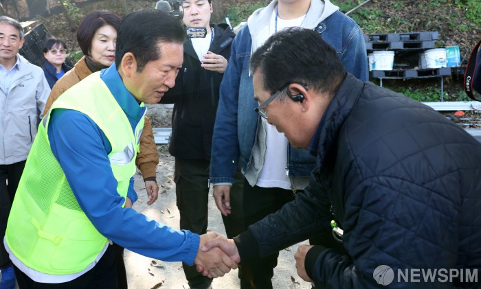 [경기=뉴스핌] 최지환 기자 = 정청래 더불어민주당 대표가 9일 오전 경기 용인시 동물보호단체 행강의 보호소를 찾아 박운선 행강 대표와 인사를 하고 있다. 2025.11.09 choipix16@newspim.com