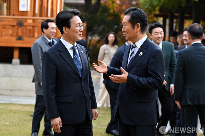 [서울=뉴스핌] 최지환 기자 = 김민석 국무총리, 정청래 더불어민주당 대표가 9일 오후 서울 종로구 국무총리공관에서 열린 고위당정협의회에 앞서 대화를 나누고 있다. 2025.11.09 choipix16@newspim.com
