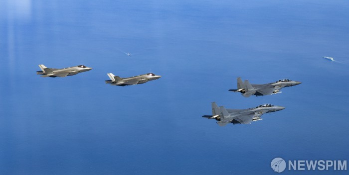 | [서울=뉴스핌] 2025 경주 아시아태평양경제협력체(APEC) 정상회의를 앞둔 27일, 공군 F-35A(왼쪽) 2기와 F-15K 2기로 구성된 편대가 공중전투초계 임무를 수행하고 있다. [사진=공군] 2025.10.27 photo@newspim.com |