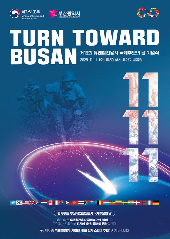 11일 오전 11시 '부산을 향한 묵념'은 6·25전쟁 당시 자유와 평화를 위해 싸운 유엔군의 희생정신을 함께 추모하는 상징적 행사로 전 세계가 동시에 고개 숙이는 시간을 갖는다. 이 행사는 2007년 캐나다 참전용사 빈센트 커트니의 제안으로 시작돼 2020년 법정기념일로 지정됐다.