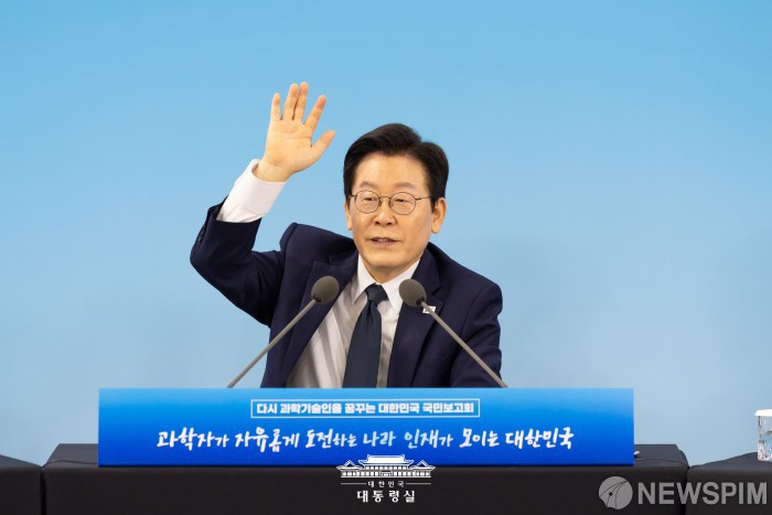 | [서울=뉴스핌] 이재명 대통령이 지난 7일 대전 유성구 국립중앙과학관에서 열린 다시 과학기술인을 꿈꾸는 대한민국 국민보고회에서 손을 들고 있다. [사진=대통령실] 2025.11.07 photo@newspim.com |