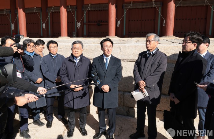 [서울=뉴스핌] 이길동 기자 = 김민석 국무총리가 10일 서울 종로구 유네스코 세계문화유산인 종묘를 찾아 최근 서울시의 세운상가 재개발 계획에 따른 영향을 살펴보고 대책을 점검한 후 발언하고 있다. 이날 종묘 방문에는 허민 국가유산청장, 유홍준 국립중앙박물관장 등이 함께 했다. 2025.11.10 gdlee@newspim.com