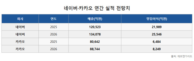 10일 증권정보업체 에프앤가이드에 따르면 네이버와 카카오는 내년 연간으로 매출과 영업이익이 모두 늘어나는 호실적을 기록할 전망이다.
