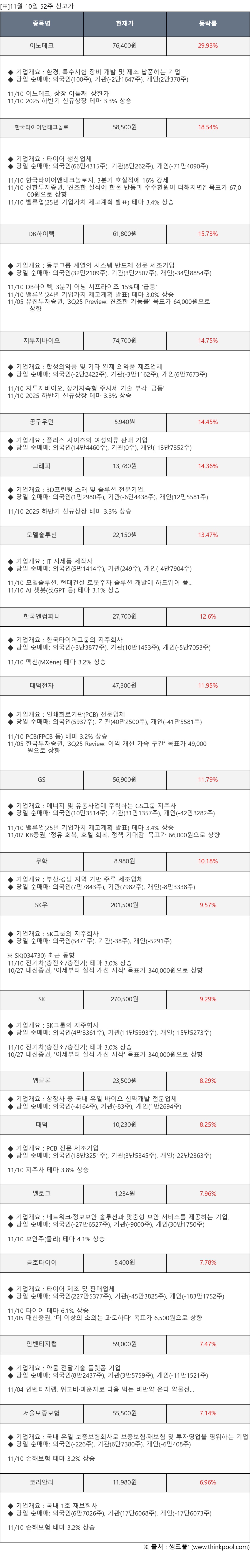 [서울=뉴스핌] 로보뉴스 = 11월 10일, 인공지능 투자비서 ‘AI라씨로’는 52주 신고가가 발생한 이노테크(469610), 한국타이어앤테크놀로(161390) 등의 최근 동향을 분석해서 발표했다.