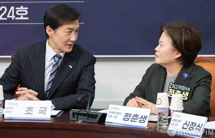 [서울=뉴스핌] 윤창빈 기자 = 조국 조국혁신당 대표 후보, 정춘생 최고위원 후보가 11일 서울 여의도 국회에서 열린 전국당원대회 출발식에서 대화를 나누고 있다. 2025.11.11 pangbin@newspim.com