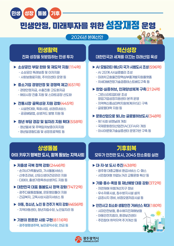 광주시는 민생에 활력을 불어 넣기 위해 소상공인 특례보증자금(75억5000만 원), 구조고도화자금(400억 원), 상생카드 발행 지원(410억 원) 등 사업을 지속 추진한다. 청년월세(79억6000만 원), 청년구직활동수당(50억 원), 일경험드림 사업(77억 원) 같은 청년 정책도 이어간다.