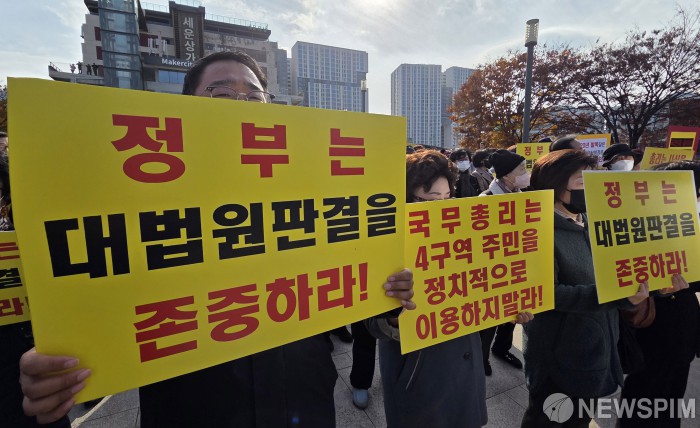 [서울=뉴스핌] 양윤모 기자 = 세운4구역 토지주들이 11일 오후 서울 종로구 종로3가 다시세운광장에서국가유산청이 유네스코 세계유산인 종묘 인근 세운4구역 재개발 사업에 문제를 제기한 데 대해 기자회견을 개최하고 있다. 세운4구역 토지주들은 "국가유산청이 재개발을 불가능하게 한다면 부당한 행정 행위에 대한 책임을 물어 손해배상·직권남용 등 민형사상의 책임을 물을 것"이라며 반발했다. 2025.11.11 yym58@newspim.com