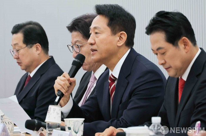 [서울=뉴스핌] 윤창빈 기자 = 오세훈 서울시장이 12일 서울 여의도 국민의힘 중앙당사에서 열린 지방선거총괄기획단 및 시·도 광역단체장 연석회의에서 모두발언을 하고 있다. 2025.11.12 pangbin@newspim.com