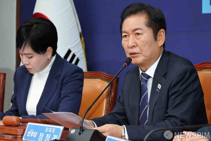 [서울=뉴스핌] 윤창빈 기자 = 정청래 더불어민주당 대표가 12일 서울 여의도 국회에서 열린 최고위원회의에서 모두발언을 하고 있다. 2025.11.12 pangbin@newspim.com