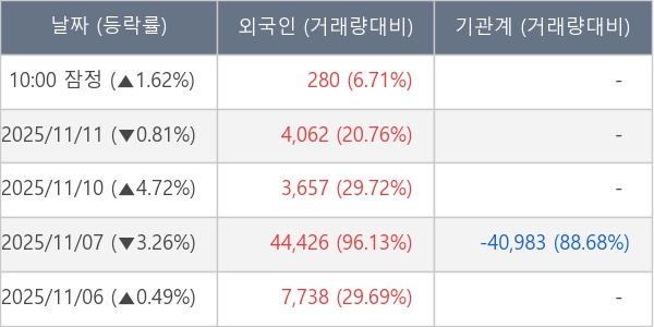 [서울=뉴스핌] 로보뉴스 = 12일 10시 15분 현재 슈프리마에이치큐(094840)는 전일 대비 1.62% (현재가 6,260원) 상승했고, 외국인이 최근 7일 연속 순매수(누적 69,793주, 잠정) 행진을 하고 있다.