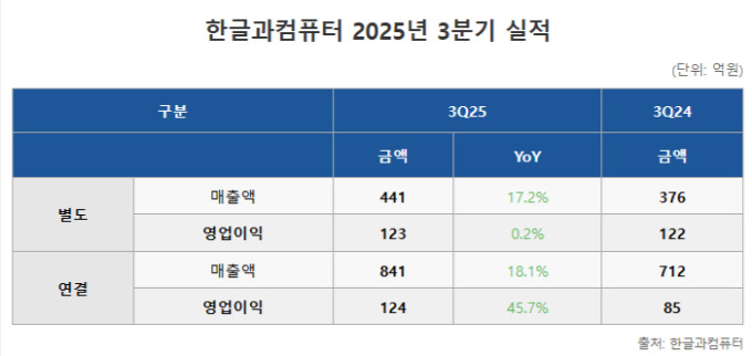 [서울=뉴스핌] 양태훈 기자 = 한글과컴퓨터(이하 한컴)가 올해 3분기 연결 기준 실적으로 매출 841억원, 영업이익 124억원을 기록했다. 이는 전년 동기 대비 매출은 18.1%, 영업이익은 45.7% 증가한 수치로, 별도 기준 실적으로는 매출 441억원·영업이익 123억원을 기록했다.