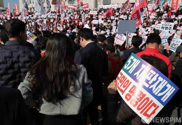 [서울=뉴스핌] 윤창빈 기자 = 장동혁 국민의힘 대표가 12일 서울 여의도 국회 본관 계단에서 열린 대장동 일당 7400억 국고 환수 촉구 및 검찰 항소포기 외압 규탄대회에서 규탄사를 하고 있다. 2025.11.12 pangbin@newspim.com