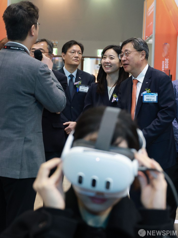 [고양=뉴스핌] 김학선 기자 = 박윤규 정보통신산업진흥원 원장과 설재진 과학기술정보통신부 디지털콘텐츠과장이 12일 경기 고양시 킨텍스에서 열린 2025 대한민국 가상융합산업대전(KMF2025)에서 전시부스를 돌며 김동규 한국메타버스산업협회 회장의 설명을 듣고 있다. 'AI와 만난 가상융합, 모두의 일상이 되다!'를 주제로 열린 'KMF2025'는 오는 14일까지 3일간 진행된다. 2025.11.12 yooksa@newspim.com