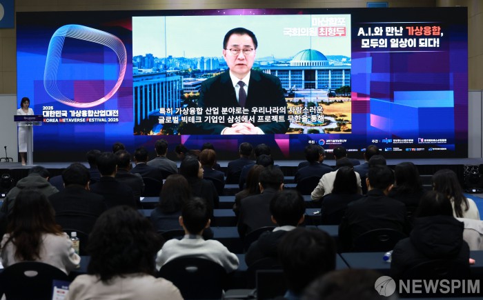 [고양=뉴스핌] 김학선 기자 = 12일 경기 고양시 킨텍스에서 열린 2025 대한민국 가상융합산업대전(KMF2025) 개막식에서 국회 과학기술정보방송통신위원회 최형두 국민의힘 간사의 축하영상이 나오고 있다. 'AI와 만난 가상융합, 모두의 일상이 되다!'를 주제로 열린 'KMF2025'는 오는 14일까지 3일간 진행된다. 2025.11.12 yooksa@newspim.com