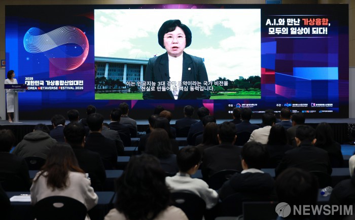 [고양=뉴스핌] 김학선 기자 = 12일 경기 고양시 킨텍스에서 열린 2025 대한민국 가상융합산업대전(KMF2025) 개막식에서 국회 과학기술정보방송통신위원회 김현 더불어민주당 간사의 축하영상이 나오고 있다. 'AI와 만난 가상융합, 모두의 일상이 되다!'를 주제로 열린 'KMF2025'는 오는 14일까지 3일간 진행된다. 2025.11.12 yooksa@newspim.com