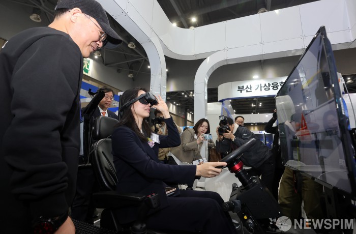 [고양=뉴스핌] 최지환 기자 = 설재진 과학기술정보통신부 디지털콘텐츠과장이 12일 경기 고양시 킨텍스에서 열린 2025 대한민국 가상융합산업대전(KMF2025)에서 전시부스를 체험하고 있다. 'AI와 만난 가상융합, 모두의 일상이 되다!'를 주제로 열린 'KMF2025'는 오는 14일까지 3일간 진행된다. 2025.11.12 choipix16@newspim.com