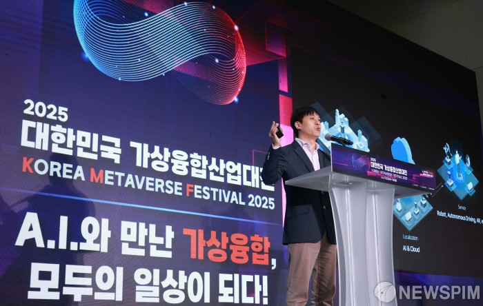 [고양=뉴스핌] 김학선 기자 = 이동환 네이버랩스 비전그룹 부문장이 12일 경기 고양시 킨텍스에서 열린 2025 대한민국 가상융합산업대전(KMF2025) 글로벌 컨퍼런스에서 '사람, 정보, 공간의 새로운 연결'을 주제로 기조강연을 하고 있다. 'AI와 만난 가상융합, 모두의 일상이 되다!'를 주제로 열린 'KMF2025'는 오는 14일까지 3일간 진행된다. 2025.11.12 yooksa@newspim.com