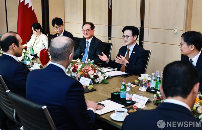[서울=뉴스핌] 김정관 산업통상부 장관이 12일 서울 종로구 포시즌스호텔에서 알 카비(Al Kaabi) 카타르 에너지 담당 국무장관과 회담을 하고 있다. 이날 회담에서 에너지 공급망 협력을 중심으로 양국 간 협력 강화 방안을 논의했다. [사진=산업통상부] 2025.11.12 photo@newspim.com