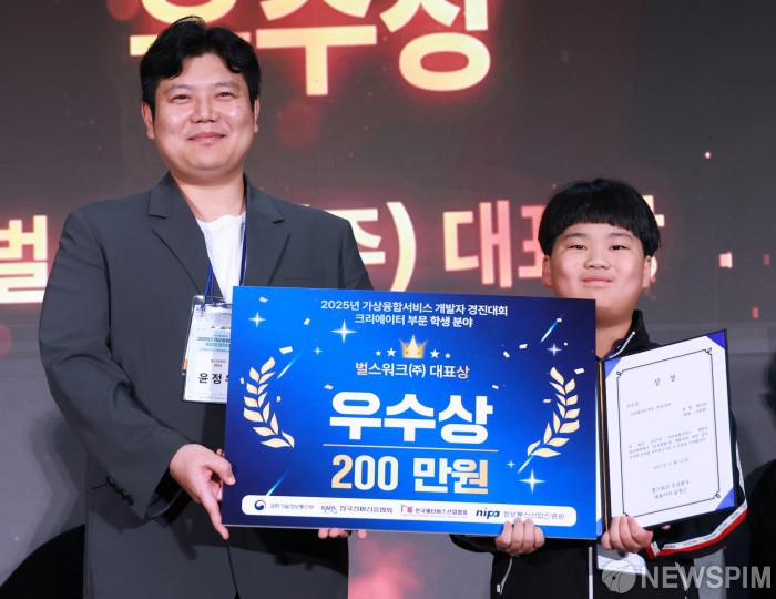 [고양=뉴스핌] 김학선 기자 = 12일 경기 고양시 킨텍스에서 열린 2025 대한민국 가상융합산업대전(KMF2025)에서 '2025년 가상융합서비스 개발자 경진대회' 크리에이터 부문 학생 분야 우수상을 수상한 '화이팅' 팀이 기념촬영을 하고 있다. 'AI와 만난 가상융합, 모두의 일상이 되다!'를 주제로 열린 'KMF2025'는 오는 14일까지 3일간 진행된다. 2025.11.12 yooksa@newspim.com