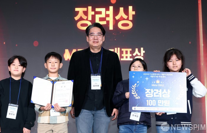 [고양=뉴스핌] 최지환 기자 = 12일 경기 고양시 킨텍스에서 열린 2025 대한민국 가상융합산업대전(KMF2025) 가상융합서비스 개발자 경진대회 개발자 부문 학생 분야 장려상을 수상한 서울길원초팀이 김진환 Meta 홍보총괄과 기념촬영을 하고 있다. 'AI와 만난 가상융합, 모두의 일상이 되다!'를 주제로 열린 'KMF2025'는 오는 14일까지 3일간 진행된다. 2025.11.12 choipix16@newspim.com